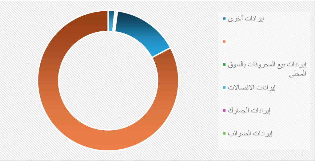 بينما شكلت باقي البنود فقط 2% من الإيرادات، حيث بلغت إيرادات الضرائب 122 مليون دينار بنسبة قليلة لا تتجاوز 0.3%، ويشير ذلك إلى ضعف القاعدة الضريبية وخلل في جمع الضرائب. وبلغت الإيرادات الجمركية 123 مليون دينار ونسبة لا تختلف عن الضرائب من إجمالي الإيرادات، وهو مؤشر على وجود مشكلة في الاقتصاد وخلل في إدارة الجمارك. ومثلت كل من إيرادات الاتصالات 15 مليون وإيرادات بيع المحروقات بالسوق المحلي 32 مليون مجتمعة أي حوالي 0.1%، في حين شكلت إيرادات واردة من مراقبات الخدمات المالية 1.5% من إجمالي الإيرادات.