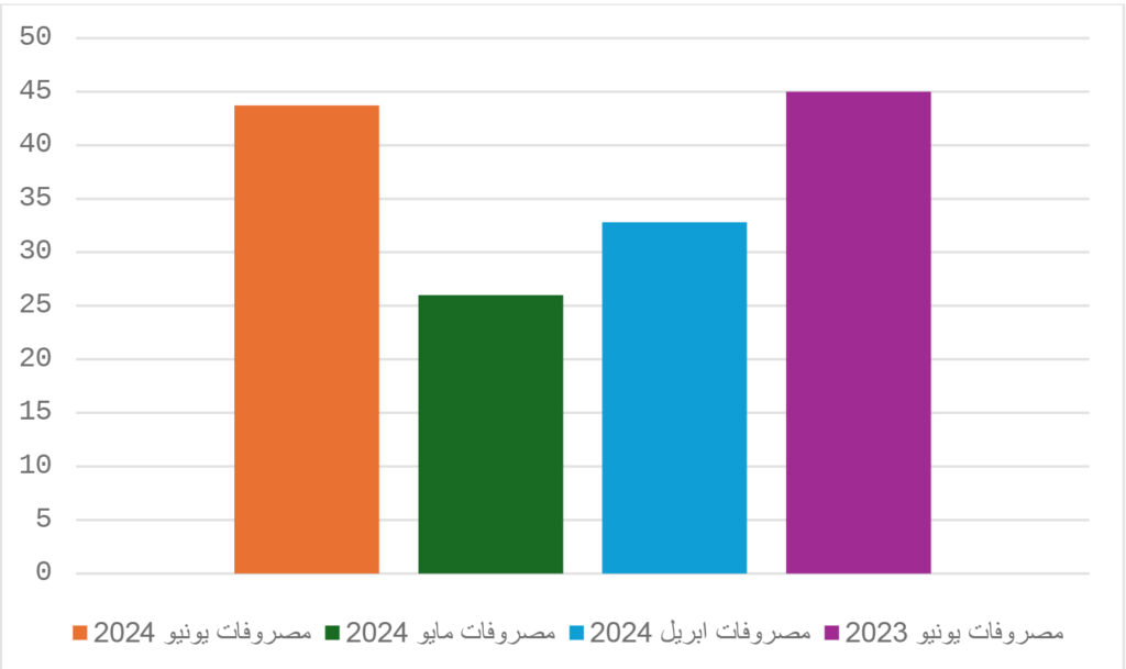 بلغت المصروفات الإجمالية 43.7 مليار دينار ليبي تشكل المرتبات الحصة الأكبر من الإنفاق الحكومي حيث بلغت 25.7 مليار دينار ليبي أي حوالي 58% على الرغم من أن مرتبات يونيو 2024 لم تضمن في هذا البيان. هذا التضخم في قيمة المرتبات يعكس اعتماد الدولة الكبير على القطاع العام في توفير الوظائف، وهو ما يشير إلى مشاكل وتحديات في كفاءة وإنتاجية هذا القطاع، في حين بلغت تكلفة الدعم 7.8 مليار دينار ليبي مشكلة حوالي 18% من المصروفات، وكما هو ظاهر فإن معظم النفقات تذهب للمرتبات والدعم، مما يراكم ضغوطاً كبيرة على الميزانية في ظل غياب واضح للاستثمار في التنمية والبنية التحتية. هذا وتجدر الإشارة هنا إلى أن خصم فاتورة المحروقات من مبيعات النفط من قبل المؤسسة الوطنية للنفط مباشرة منذ نوفمبر 2021 مازال مستمرا ما يمثل تحديا خطيرا في الإفصاح عن الحجم الحقيقي لتكلفة الدعم وأثره وتداعياته على الميزانية العامة، ويعتبر الدعم جزءاً مهماً من السياسة الاقتصادية لضمان استقرار الأسعار وحماية الفئات الضعيفة، لكنه قد يؤدي إلى ضغوط مالية إذا لم يتم إدارته بشكل شفاف واستمر بشكله الحالي دون اصلاح.